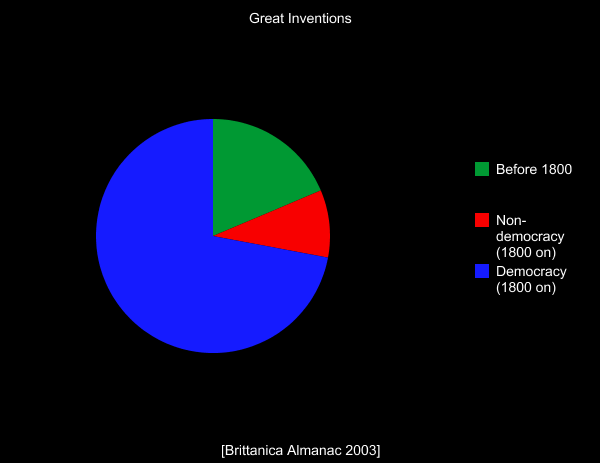 Of the 262 great inventions after 1800, all but 30, i.e. 88.5%, occurred in ostensible democracies, despite the fact that a majority of the world's population during this period lived in non-democracies. It appears that important inventions occur about 10× faster in democracies.