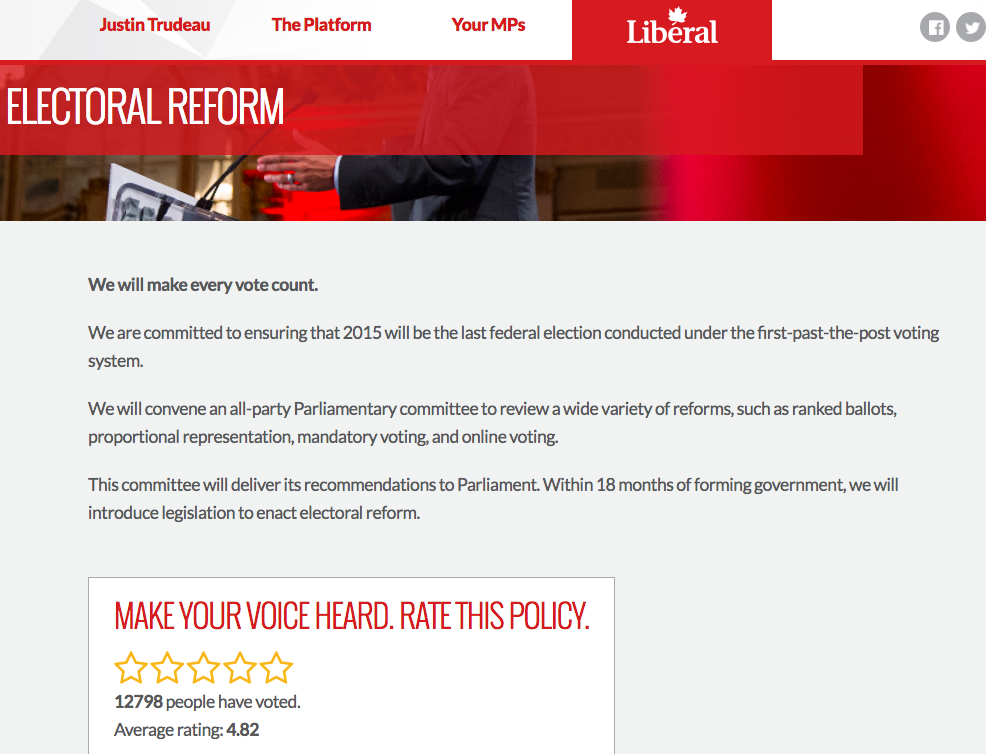 Justin Trudeau became Prime Minister in 2015 having pledged to replace Canada's first past the post voting system with something better before the next election, i.e. before 2019. Voting theorists do not employ the silly name "first past the post" (there is no post...) but rather call it "plurality" voting. It is widely agreed among those knowledgeable in voting systems that plurality is a very poor system. It solicits the least possible amount of information from voters ("name one candidate, then shut up"); it often encourages even that small amount of information to be a lie; it suffers from "wasted vote," "vote splitting," and "cloning" pathologies; and it has often yielded quite "disproportional" parliaments that failed to duplicate the true sentiments of Canadians. At the Du Baffy voting procedures workshop held in Normandy France in 2010, zero participants rated plurality acceptable out of 18 systems they considered.