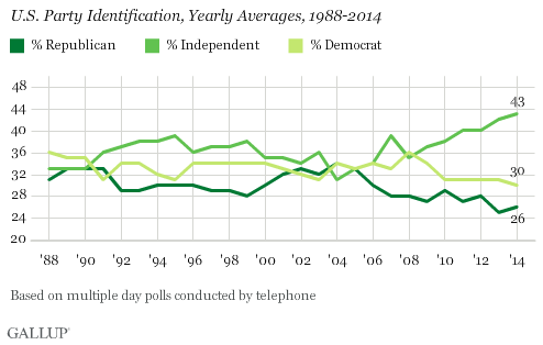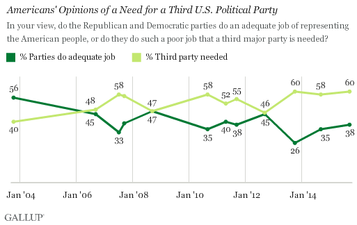 The USA is unhappy about being stuck in 2-party domination. This could lead to 1-party domination and collapse. As of year 2014, more of the USA's voters are independent than in any party, but you sure could not tell that from its congress, which is over 99% composed of Democrats and Republicans.