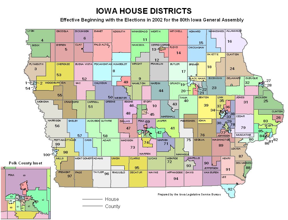 Is Iowa gerrymandered? Supposedly Iowa has a non-partisan district-drawing process that improves on most of the Nation. But the fact is that the jigsaw-like map of congressional districts looks gerrymandered, although it is not as blatantly obvious as in, say. Arizona. (Arizona's maps were also drawn by a "nonpartisan" commission. Ha! These commissions often are not "non" but rather "bi"partisan and thus draw districts intended to keep everybody from both sides "safe." And indeed the Iowa legislature rejected the first district drawing attempt by the commission, and then after accepting the second try enjoyed a 98% re-election rate.) But when you examine maps of state-house districts gerrymandering seems clearer: there are numerous fractal-shaped districts with no explanation that I can imagine for their weird shapes, other than gerrymandering. So I believe there is some gerrymandering going on, although my eyeballs say Iowa seems comparatively good in that respect.