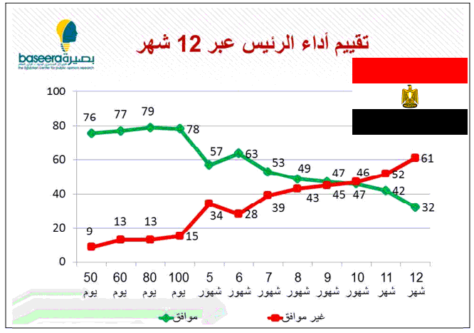 And indeed, Morsi won... Egypt degenerated further... and now (July 2013) Egypt's fledgling democracy seems to be about to self-destruct with Morsi widely perceived as a failure. As of July 2013 Morsi's approval rating is down to 24%, although it once was 75%.