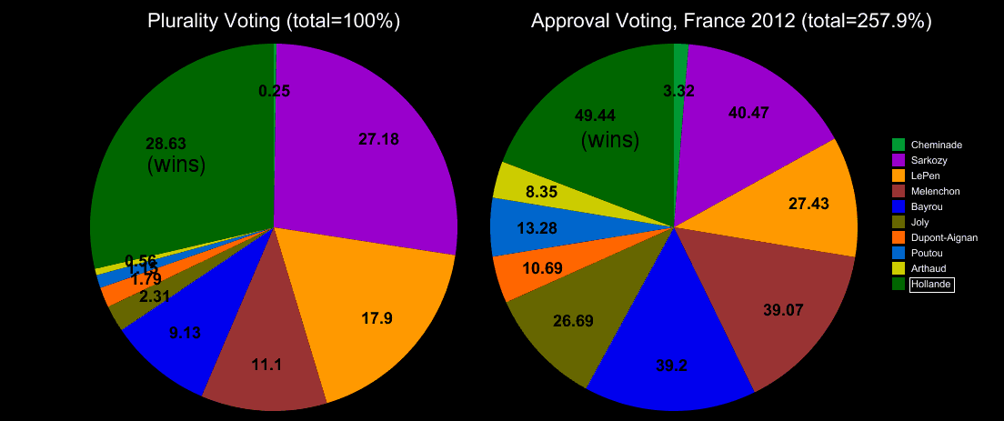 Sarkozy and Le Pen had the "narrowest" support. That is, voters for them approved the fewest rivals, and conversely (the data also shows), voters for others rarely were willing to approve them. As the study-authors point out, approval voting tends to disfavor such narrowly-supported candidates (they call them "exclusive") favoring more "inclusive" candidates. A related and here hard-to-disentangle effect which we had discovered many years before using "Yee diagrams," is that approval voting tends to favor "centrists" while plurality and instant runoff tend to favor "extremists."
