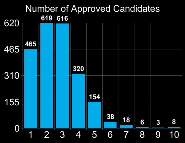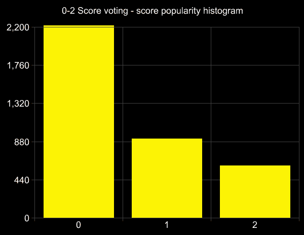 The typical approval ballot approved 2.57 candidates (mean), but as you can see from the above histogram, some ballots (465, or 20.7%) approved only one, while 8 ballots (0.36%) approved all 10. As you can see from the table at right, the voters for the official 5 top candidates (yellow) tended to approve fewer (unweighted mean 2.61) and the voters for the 5 bottom candidates tended to approve more (unweighted mean 3.21) options. That suggests they had some appreciation of approval voting strategy – if your favorite has little chance of winning, it makes sense to also approve more options to increase the chance of your ballot having an impact.