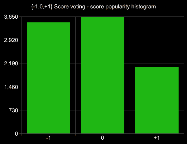 It is quite surprising that the {-1, 0, +1} voters had a lower spoilage rate than the {0,1,2} voters. (One might have naively expected negative signs to cause more confusion.) However, keep in mind that the numbers of nonblank spoiled score-ballots at the three locations were 6, 8, and 8 respectively, meaning (since these were very small numbers) that the "noise" in these spoilage percentages is very large. So this "conclusion" might just be statistical noise.