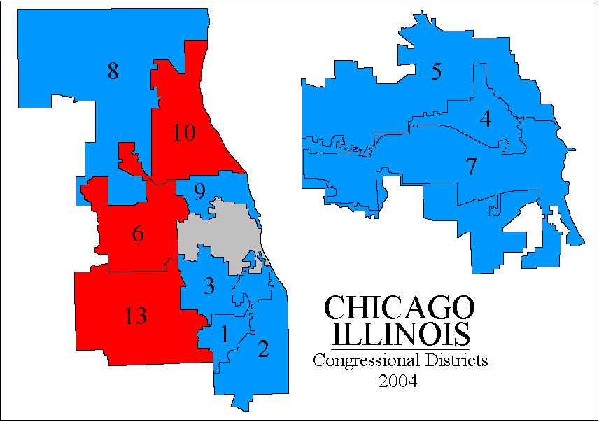 Illinois' 19 congressional districts (pdf; as they were in 2004). Wow. I thought Texas was bad, but Illinois may be the new champ. District 17 is just awesome. But then again districts 19, 15, and 11 are no slouches. You cannot actually see a lot of the small Chicago districts without a magnifying glass, so here is a closeup view (gif) [this picture is from Adam Carr's psephos database] color coded by party control in 2004. Districts 1, 10, 8, 5, and 7 are pretty bad, but district 4 is a wowser! (Notice it looks pretty bad... but then you realize it actually continues west past the point you thought it had ended... going along a thin strip lying entirely inside a highway... which loops around until expanding to enclose a second bad-looking region.)