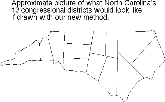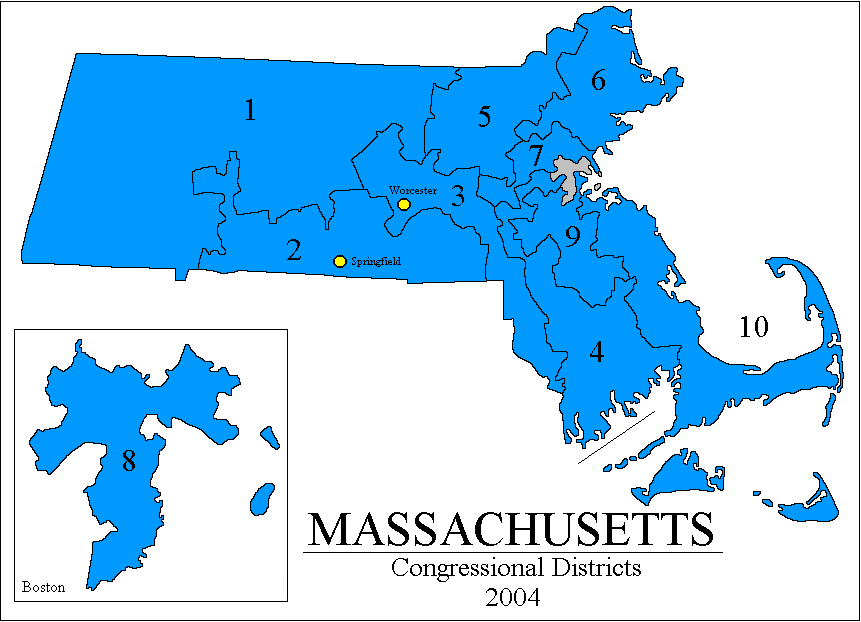 Massachusetts''s 10 congressional districts (map from Adam Carr's Psephos archive) (gif fastest) (png middle) (jpg slowest) versus approximate sketch of how it would look redrawn with our algorithm: (png fastest) (jpg slower) It was Massachusetts governor Elbridge Gerry who is credited with inventing gerrymandering in 1812. He was voted out of office immediately by outraged voters, but his legacy evidently lives on. Massachusetts has 100% Democratic congressmen and has for at least the last three election cycles, despite having a Republican governor (you can't gerrymander the governor race, since it is a statewide election). Here's a Boston Globe Editorial on the subject.