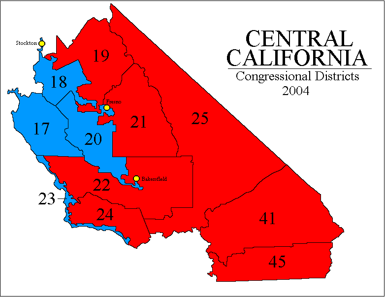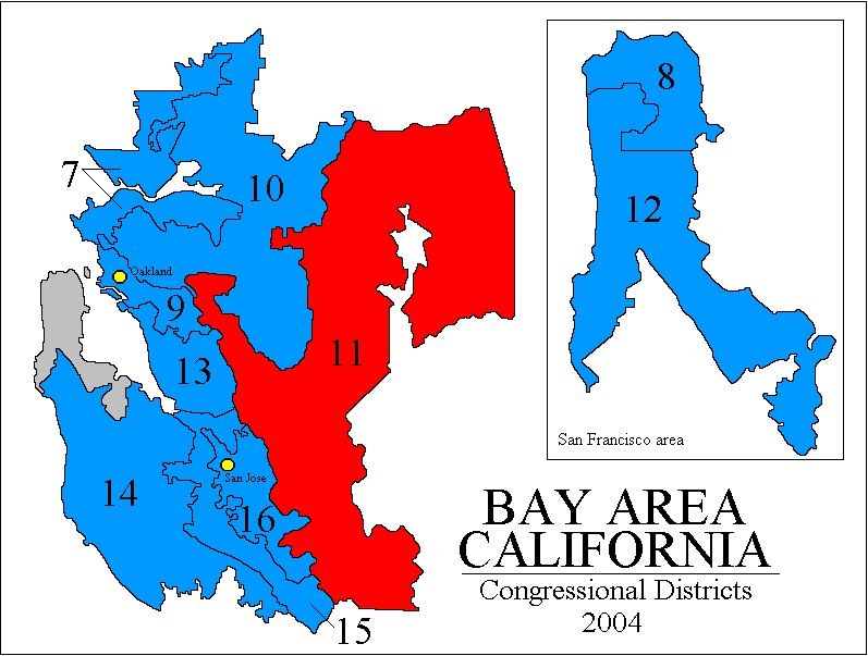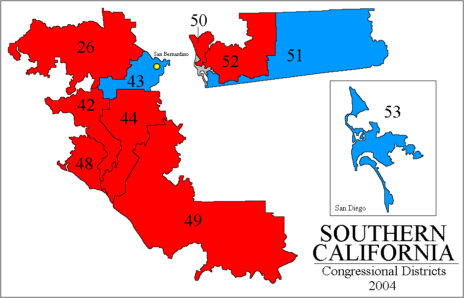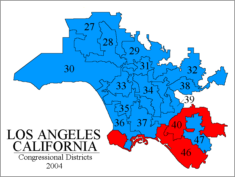 California? In 2004, not one of CA's 173 state legislative and federal congressional seats changed party-hands. In 2002, every incumbent won re-election, on average with 69% of the vote. California may be the new gerrymandering champion, perhaps even worse than Illinois and Texas, but unlike them its gerrymandering is "bipartisan" that is, arranged by agreement among the Democrats and Republicans to "design their own districts" to make every office holder "safe." (Later note: see this about the new random-commission system CA adopted in 2010-2011!) ( Specifically, CA state law causes any redistricting not approved by at least 2/3 of the state legislature to be challengeable by the voters in a referendum. That forces the Democrats in control of California to gerrymander for at least some Republican legislators too. Republican Assemblyman Roy Ashburn, vice-chair of the redistricting committe, told the San Diego Union-Tribune in May 20-01 "I think it is very possible... we can achieve a bipartisan redistricting... it takes openness and willingness to compromise." And indeed the deal that was struck was to protect almost all incumbents from both parties, allowing Democrats to keep all their seats but also the Republicans could do so, plus the Democrats would draw one new district – mandated by population growth – in such a way that they would get that new one too. Only a few were troubled by the result, e.g. Republican Assemblyman Tim Leslie told the LA Times "We won't have to worry about elections for six, eight, ten years because [the districts] are all pre-set. Everybody wins... What happened to drawing lines for the people of the state rather than ourselves?" ) The devil's jigsaw puzzle (gifs from Adam Carr's psephos database): Northern Calif, Calif Bay Area, Central Calif, Los Angeles area, Southern Calif. All of Los Angeles is amazing but district 53 in Southern Calif. (San Diego) is especially neat since it actually goes out to sea and comes back to land.