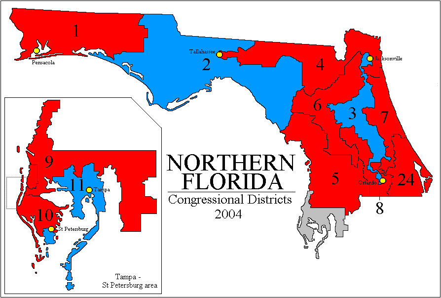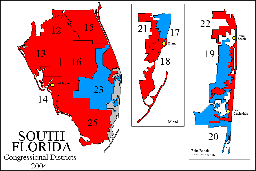 Florida? Holy cow, Florida (especially Eastern) may be even worse than California! (color pdf), (Northern FL, gif from Psephos), (Southern FL, gif from Psephos with closeups). The district 22 & 23 tandem team is just beyond belief trying to neutralize as many Democrats as possible so that Florida as a whole can be safely massively Republican-dominated; you really need the closeup map to see its full glory. [Alcee Hastings, an impeached Federal judge convicted of multiple counts of bribery, was re-elected by the 23rd. Gee, I wonder why.]