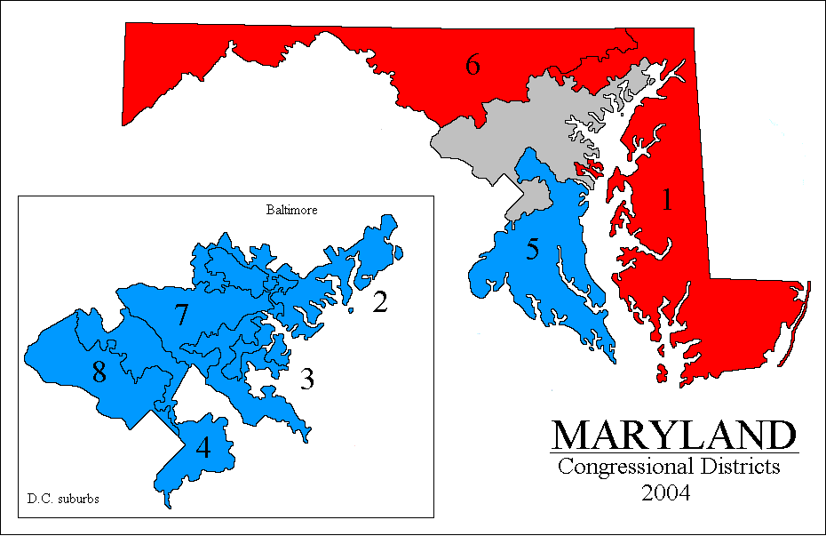Maryland's 8 congressional districts (gif; as they were in 2004). Holy sea of rattlesnakes Batman! Numerous go out to sea and come back to land districts, amazingly squirelly boundary shapes. Here's approximately how it would look redistricted via shortest splitline (png).