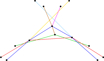 The segments in H can be decomposed into ≤n/2 convex chains as follows. Start with a vertical line through one of the n/2 leftmost points p in S, and rotate this line clockwise around p until it contains a segment pq in H. Initially, there are less than n/2 points above the line; this number goes down whenever the line hits a point to the left of p, and goes up whenever it hits a point to the right of p. It follows that q must lie to the right of p. Continue rotating the line clockwise around q until it hits another segment in H (which will lie to the right of q), and so on, until the line is vertical again. The sequence of segments hit by the rotating line forms a convex chain, and every segment in H is in exactly one convex chain. (These convex chains are dual to the concave chains studied by Agarwal, Aronov, and Sharir.)
