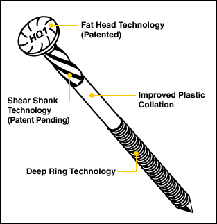 Picture from Popular Science Magazine, which gave this nail its 2006 "innovation of the year" award. Nail is 2.5 inches long and available from Bostitch Corp. in 0.113 and 0.131 inch diameter.