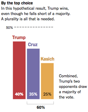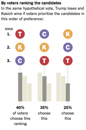 Using the current system, however, the plurality winner would be Mr. Trump – with 40 percent support. Yet he would surely be an odd choice, since he would be defeated not only by Mr. Kasich but also by Mr. Cruz (in both cases by 60 percent to 40 percent) in pairwise comparisons. Note also that Mr. Kasich, the majority winner, would come in a poor third under the current system, with only 25 percent support.