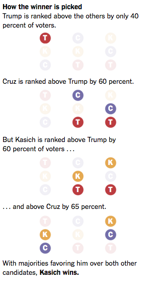 For example, imagine a hypothetical primary in which 40 percent of voters preferred Mr. Trump to Mr. Kasich and Mr. Kasich to Mr. Cruz, while 35 percent ranked them in the order Mr. Cruz, Mr. Kasich, Mr. Trump, with the remaining 25 percent placing them in the order Mr. Kasich, Mr. Cruz, Mr. Trump. Mr. Kasich would be the real majority winner here – defeating both Mr. Trump (60 percent to 40 percent) and Mr. Cruz (65 percent to 35 percent) when the candidates are compared pairwise.