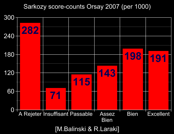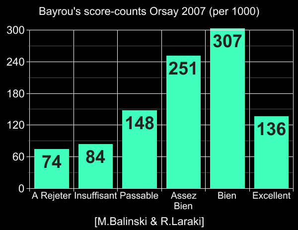 For example, in Balinski & Laraki's own MJ vote data in France 2007, none of the candidates had tightly bunched score-distribution, and Sarkozy (the MJ winner according to Balinski & Laraki's extrapolation to all France) had a strongly two-peaked distribution (peaks at 0 and 4 on 0-5 scale). Thus exactly this problem happened in Balinski & Laraki's own experiment (a fact they did not notice)! – Sarkozy won with MJ, but the democratically-correct winner should have been Bayrou. (Both rank-order and 33 pairwise polls all unanimously and indisputably show Bayrou would have defeated Sarkozy in a two-candidate simple majority vote, indeed would have defeated any rival X in a Bayrou-versus-X vote; also Bayrou won with approval voting, {0,1,2} score voting, and {0,1,2,3,4,5} score voting; and finally in retrospect later polls showed France wished Bayrou had won, e.g. near the end of Sarkozy's term France preferred Bayrou>Sarkozy by landslide 56-35 margin pairwise.)
