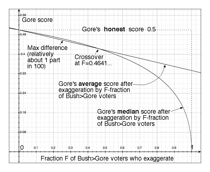 In the scenario above if a fraction-F of all voters exaggerate (now independent of their politics, i.e. no longer 1-sided) then we get average=median=0.5 for both Bush & Gore, i.e. the 2-sided strategizing & counterstrategizing exactly canceled out in both systems.