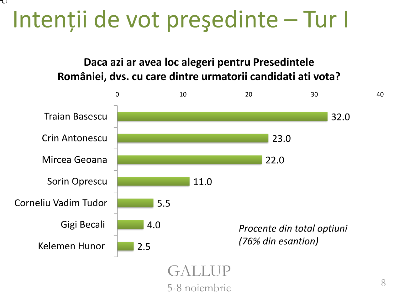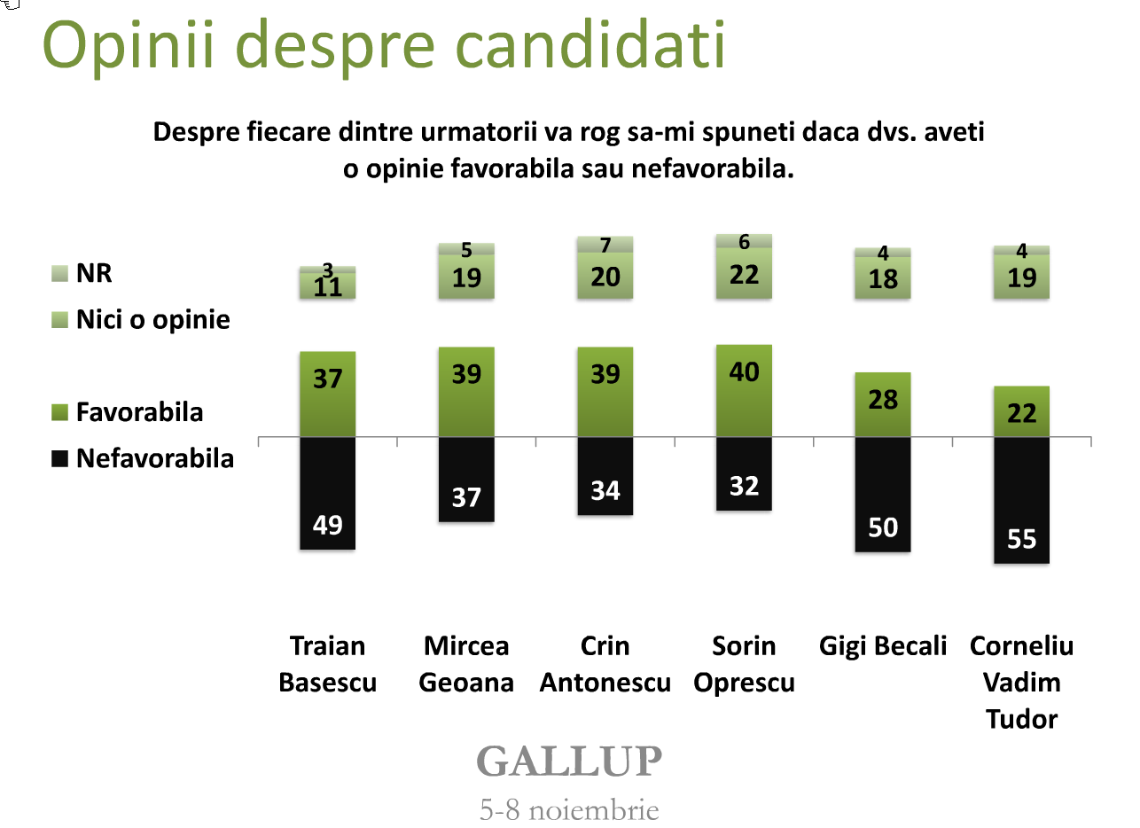 Gallup Romania during 5-8 November conducted both an Approval-voting-style poll and a Plurality-voting-style poll (1253 adults [age≥18] representative of the Romanian voter population; "stratified sampling" techniques used; face-to-face interviews at their homes), and the two graphics (provided by Gallup) give the results.
