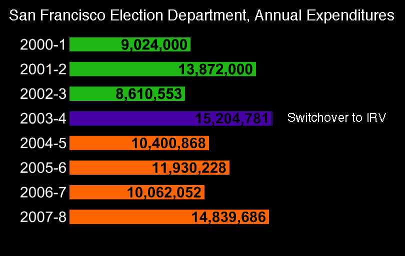 2000-2001 $ 9,024,000 2001-2002 $13,872,000 [includes $1,322,849 for a runoff election & $150,000 litigation costs] 2002-2003 $ 8,610,553 2003-2004 $15,204,781 --switchover to IRV 2004-2005 $10,400,868 2005-2006 $11,930,228 2006-2007 $10,062,052 (actual expense; originally budgeted=$9,126,318) 2007-2008 $14,839,686 (actual expense; originally budgeted=$19,809,917)