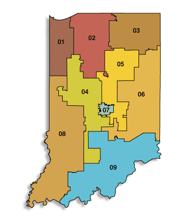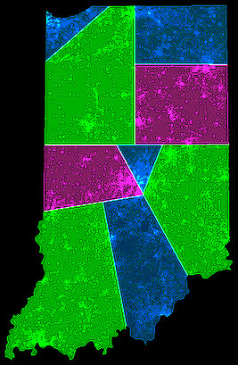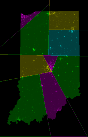 Indiana 2007: official vs splitlined districtings.