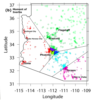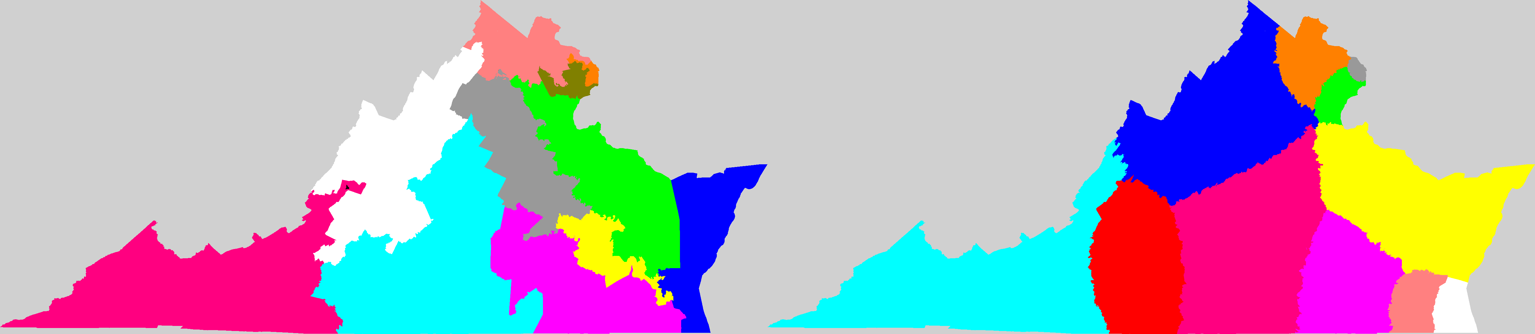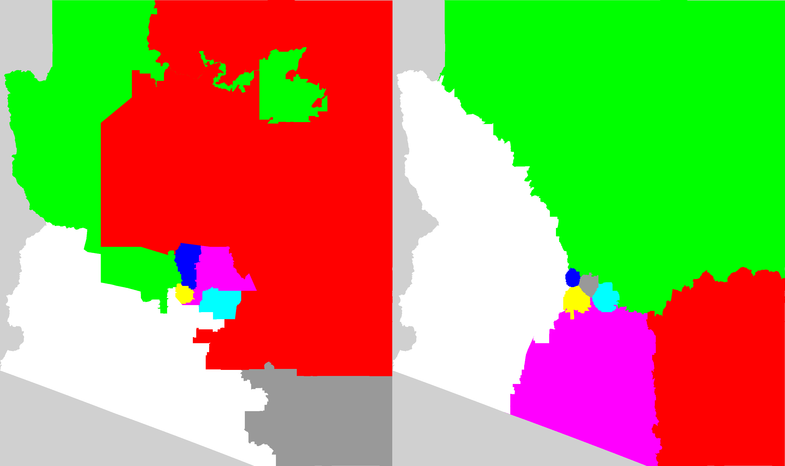 AZ (8 districts) | Official & Olson* | Splitline | Σdist²-based | Districted by an "independent commission" (ha!); note the green district is contiguous, but joined by filaments too fine to see since <½ pixel wide. |