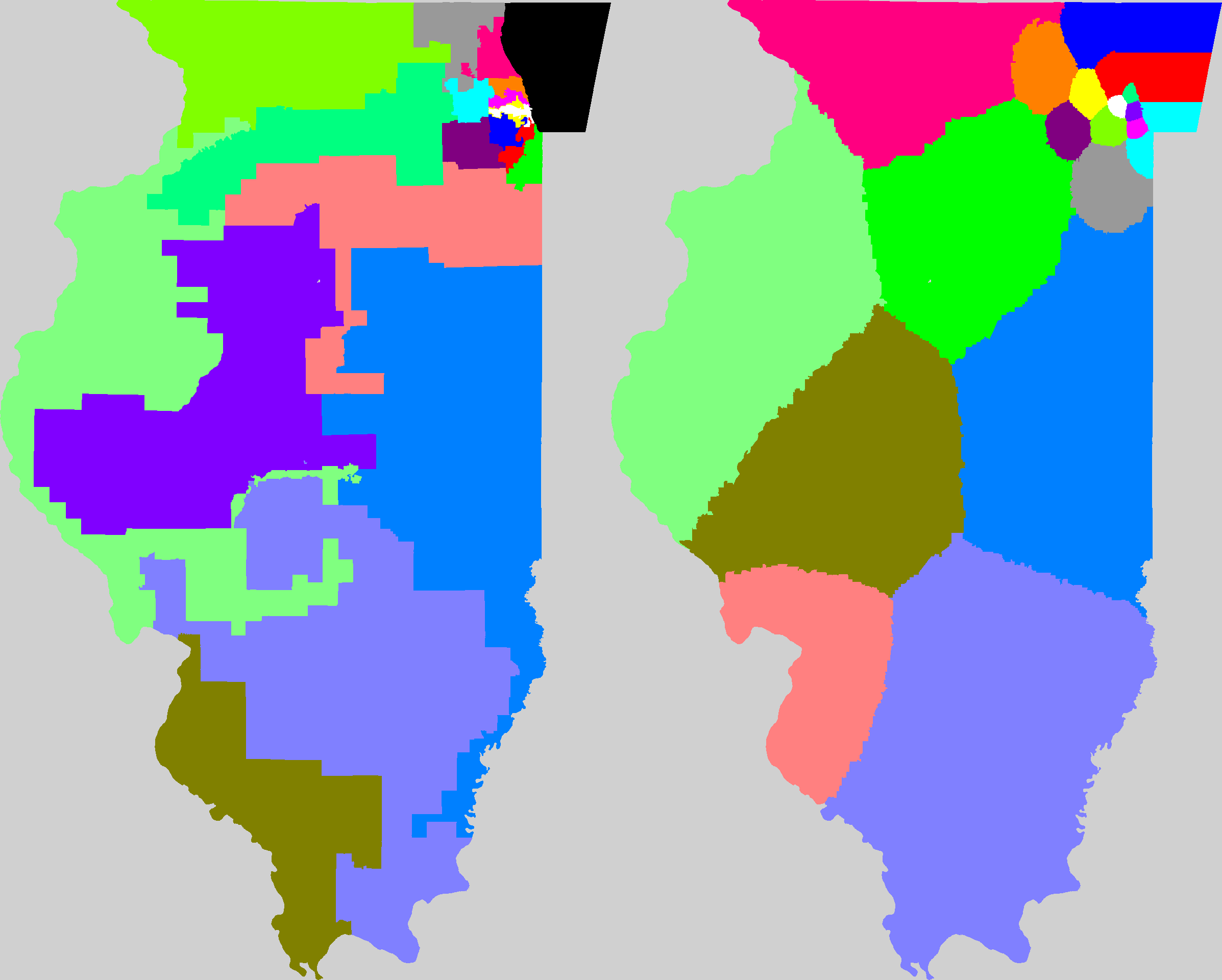 Perhaps such manipulations could force "evil wiggly" boundaries with one or other of the two other optimality notions, also – I'm not sure. I am certain this kind of manipulation-potential is greatly diminished if district drawings are unrestricted, i.e. district boundaries are allowed to cut through census blocks.