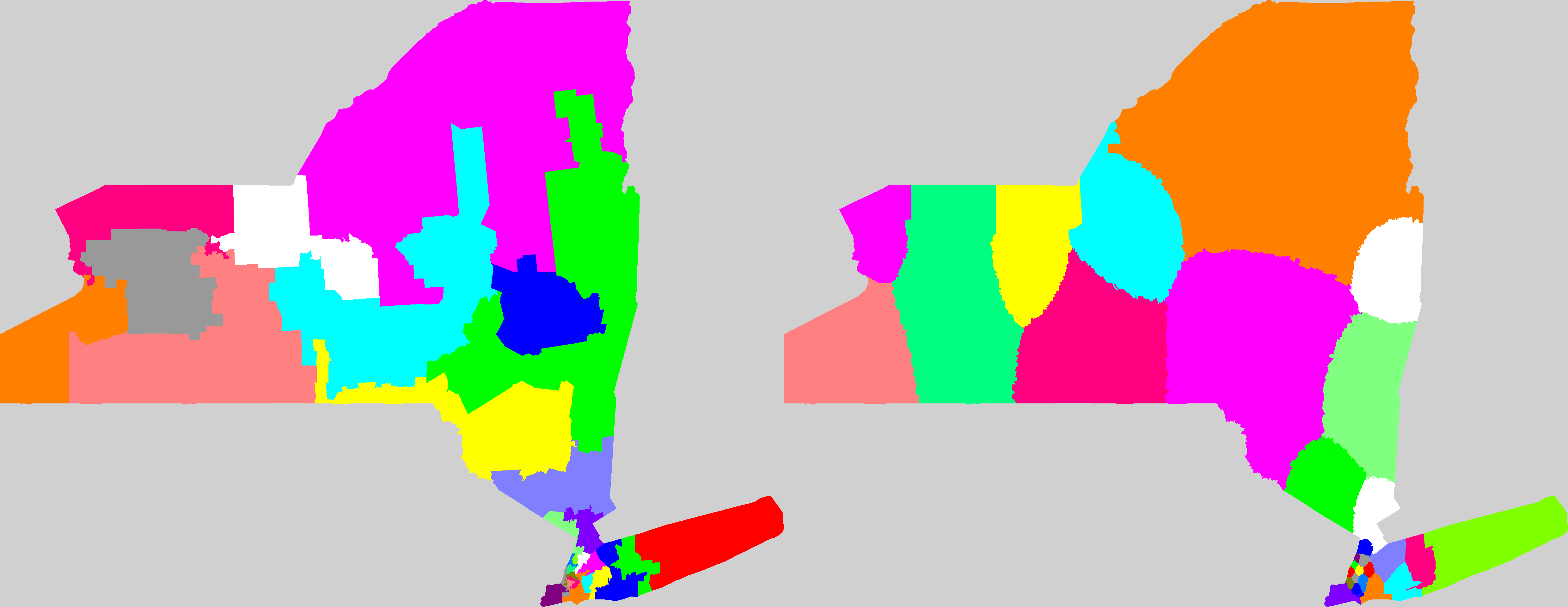 NY (29 districts) | Official & Olson | Splitline* | Σdist²-based | Census dept. provided erroneous geographic data (chopped off part of Long Island near Greenport). |