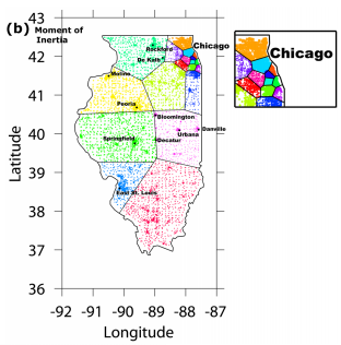 Heuristic algorithm based on matching: Here's an interesting idea. Observe that if P=2N, i.e. if we were trying to divide our country into "districts" each containing exactly 2 people, then the optimum districting (for any of our three quality measures) could actually be found in polynomial(N) time by finding a min-cost matching in the complete (nonbipartite) graph of all people (with edge cost being the squared-Euclidean or unsquared-spherical distance between the two people). But in the real world P>>N. That suggests taking a uniform random sample, of, say, 256N people from among the P, then finding their min-cost matching and replacing each matched person-pair by a random point on the line segment joining them (thus reducing to 128N pseudo-people) then continuing on reducing to 64N, 32N, 16N, 8N, 4N, and finally 2N pseudo-people, then employing their matching's midpoints as our N initial district centers for use with the 2-phase improvement procedure. Software exists which will solve an N-point geometric matching task quickly and usually almost-optimally for the numbers of points we have in mind here (Fekete et al 2002).