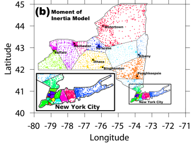 We simply continue applying these two-phase improvement cycles until no further improvement is possible, then stop. At that point we have found a "local optimum" districting, i.e. one whose cost cannot be decreased either by moving the district centers or by differently assigning the people to those district-centers (but improvement could be possible by doing both simultaneously). Each 2-phase improvement step takes only polynomial time, but it is conceivable that an exponentially long chain of improvements will happen (see Vattani 2011 for a point set in the plane that causes our 2-phase iteration to iterate an exponentially large number of times, all the while keeping all districts equipopulous to within an additive constant). But usually the number needed is small. We can perform this whole optimization process many times starting from different initial district-maps, selecting only the best among the many locally-optimum maps thus produced.