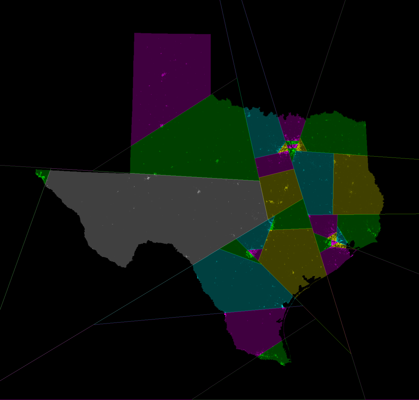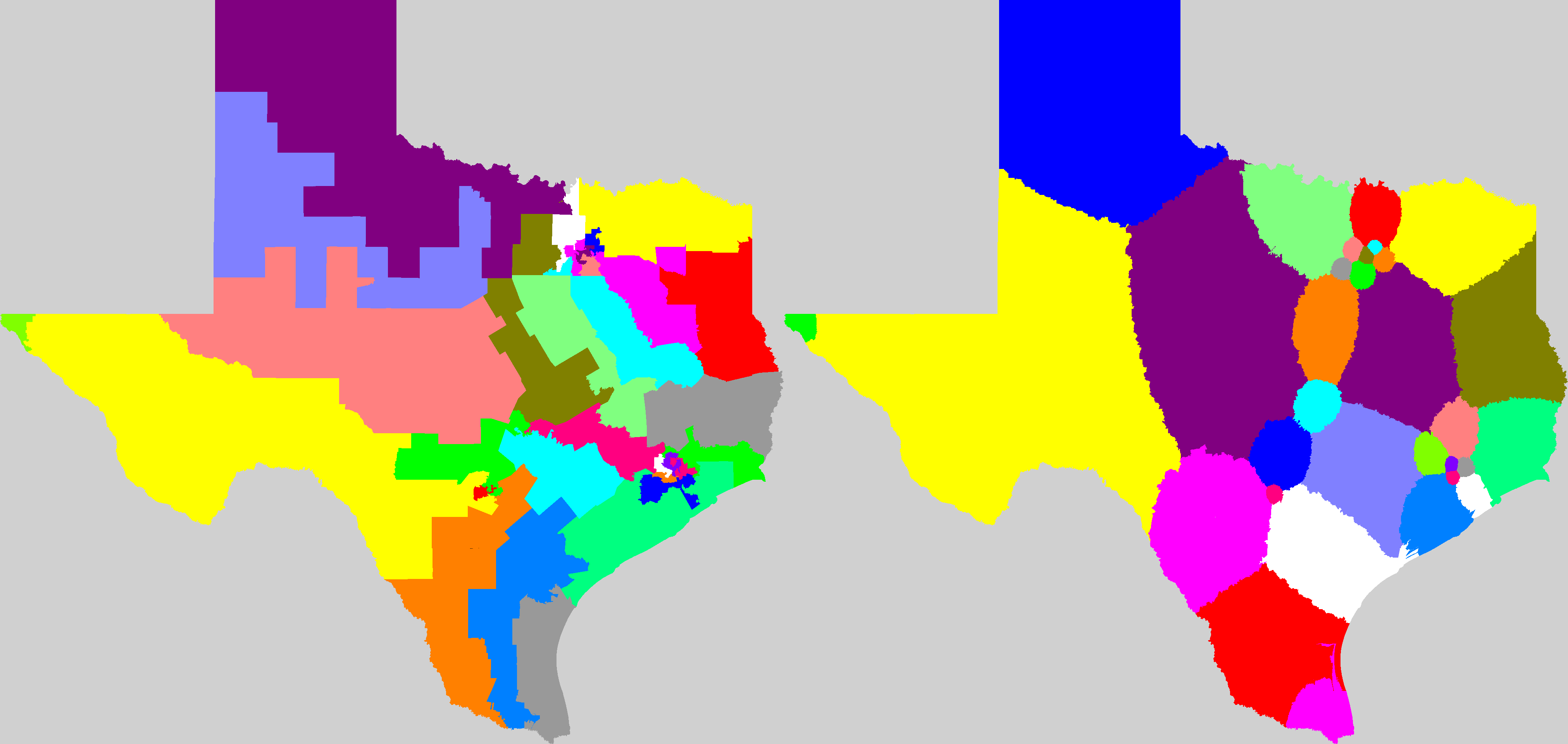 Consequently, it seemed reasonable to guess that Olson and splitlining would often output quite-different maps. However, examining Olson's 50 USA state maps (based on year-2000 census) versus our splitlining-based maps of the same 50 states, we find that they actually usually are astonishingly similar! Consider Texas. Left top, the official district map produced by the gerrymandering slimeballs in the TX legislature (32 districts). Right top, Olson's near-optimal map. Bottom left: splitlining's map. Bottom right, map by Spann, Gulotta & Kane trying to minimize a sum-of-squared-distances based measure (they use a method like our 2-phase improver working on a "flat Earth" allowing up to 4% population difference between the most- and least-populous districts).