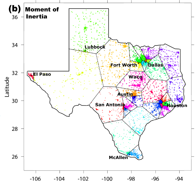 Minimize sum of distances to your district-center | Yes (finding optimum is NP-hard) | Districts generally nonconvex both on the sphere and on a flat Earth; boundaries are piecewise-algebraic curves that are complicated to describe. | It is probably possible to get within some constant factor of optimum in polynomial worst-case time, but nobody has shown that yet. We've shown how to get within a log-factor of optimum. | Olson has programmed a heuristic algorithm to seek districtings good by this measure. See his USA (year-2010 census) results. |
