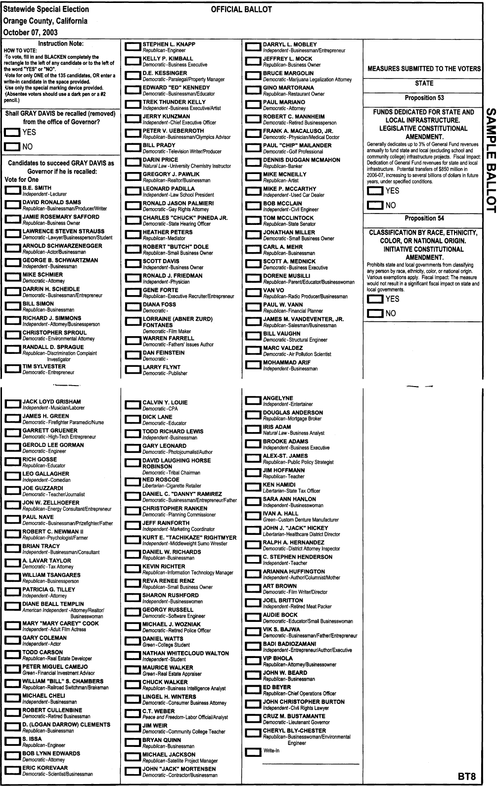 was a rich and famous movie star, in large part due to him having spectacular muscles acquired with the aid of anabolic steroids. (Won Mr. Universe and Mr. Olympia pro body building titles multiple times 1967-1980 as well as several national weightlifting championships. Although he admitted steroid use, A.S. never faced any legal repercussions for it, unlike such athletes as Lance Armstrong, Marion Jones, and Barry Bonds.) He'd never held any government office, had only a high school education, and seemed to be one of the world's greatest narcissists. Sixteen women came forward to the press claiming Schwarzenegger had sexually molested them. Running against him in 2003 for the governorship of California were 134 opponents. (Sample ballot.) None were as rich as him. None were as famous as him. None had as many women complaining of unwanted sexual "grope-gate" to the press, as him. Many, however, had more education, more government experience, and/or were more willing to participate in debates.