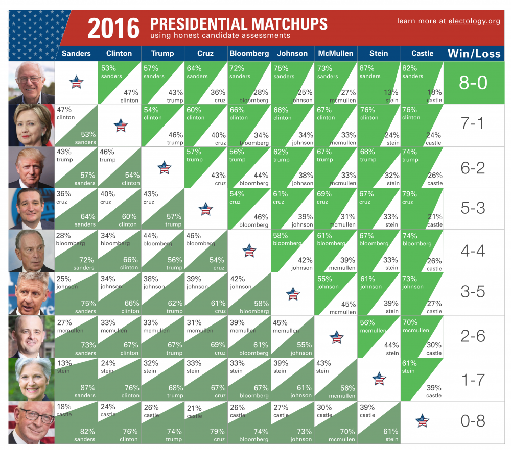 Sanders | In the 21 pairwise polls compiled by RealClearPolitics.com during March, April, and May 2016, Sanders won them all. His smallest margin of victory was 46-42 and his largest 58-34. |
