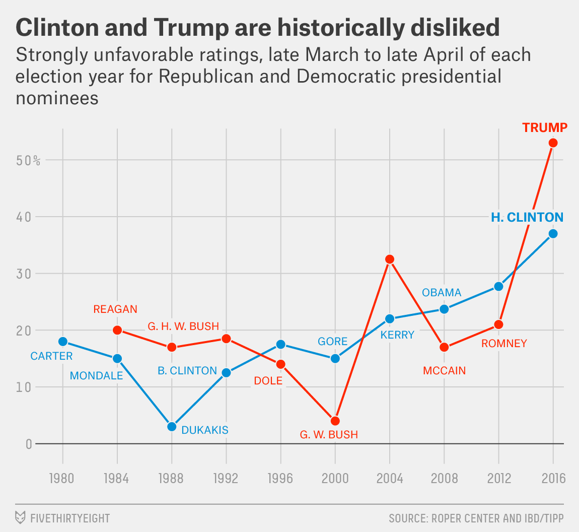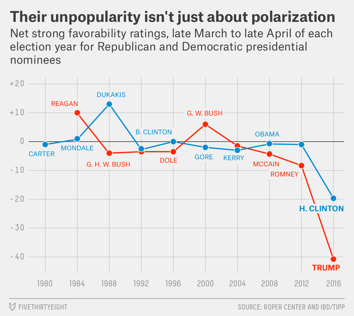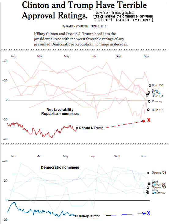 The poll-aggregators RealClearPolitics.com and Huffpost Pollster helpfully compiled favorable/unfavorable ratings (i.e approval-style polling; our RCP poll-averages covered the period 28 Oct to 7 Nov 2016 while HuffPost via "trendlines" for their poll-collection attempted to produce results valid for election day 8 Nov). The table gives their final pre-election-day results.