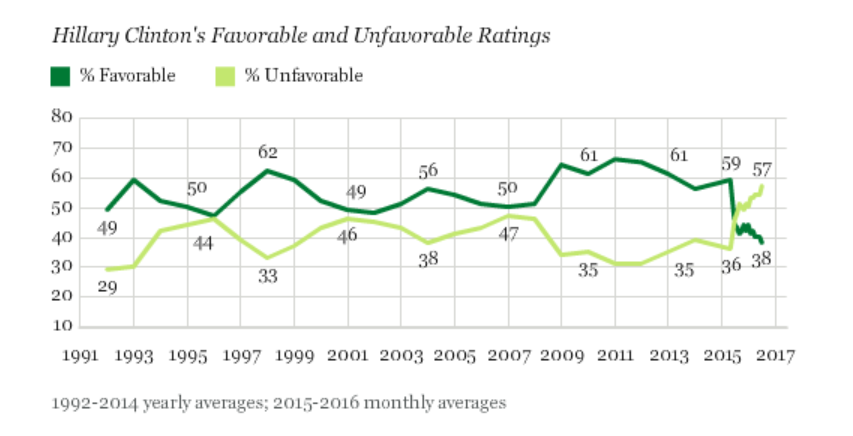 It also is worth noting that Hillary Clinton's low approval ratings are of recent vintage, as we see in this graphic from Gallup: