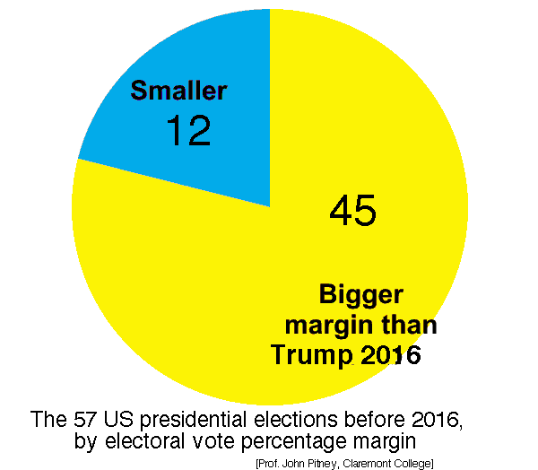 Trump's electoral college margin in 2016 ranked 46th-from-top (percentagewise) out of the 58 USA presidential elections according to data compiled by Prof. John Pitney, while his popular vote loss was by far the largest among all Presidents. Trump described this as